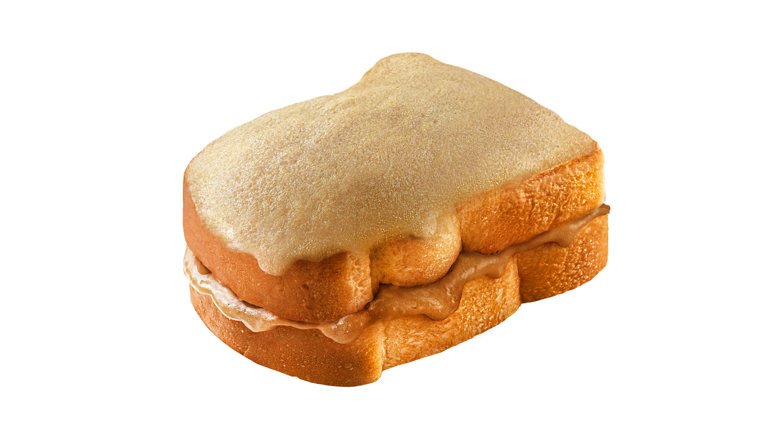 Roti toast tebal dengan isian susu kopi manis, ditambah topping kopi yang manis